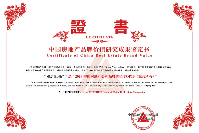 9月10日,中國(guó)房地產(chǎn)TOP10研究組在北京舉辦“2019中國(guó)房地產(chǎn)品牌價(jià)值研究成果發(fā)布會(huì)暨第十六屆中國(guó)房地產(chǎn)品牌發(fā)展高峰論壇”。憑借優(yōu)秀的綜合實(shí)力和杰出的品牌價(jià)值,雅居樂(lè)地產(chǎn)榮膺“2019中國(guó)房地產(chǎn)公司品牌價(jià)值TOP10(混合所有)”,位列第4名。研究組信息顯示,通過(guò)系統(tǒng)測(cè)算,雅居樂(lè)地產(chǎn)的品牌價(jià)值達(dá)313億元。