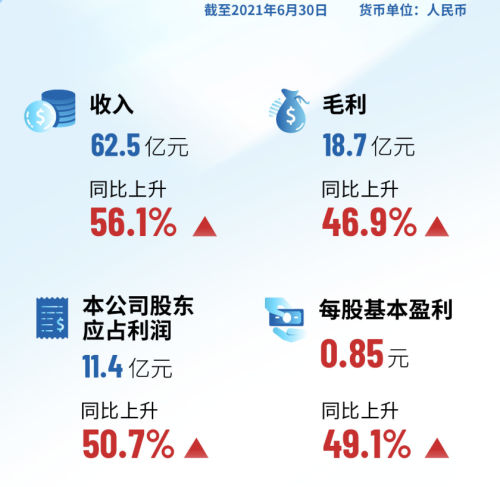 2021年上半年,集團(tuán)業(yè)績實(shí)現(xiàn)高質(zhì)量發(fā)展。公告顯示,集團(tuán)上半年營業(yè)額為人民幣62.47億元,較去年同期增長56.1%;毛利18.73億元,同比增加46.9%,毛利率為30.0%;股東應(yīng)占利潤為11.42億元,同比增加50.7%。每股基本盈利為0.85元。